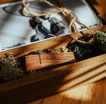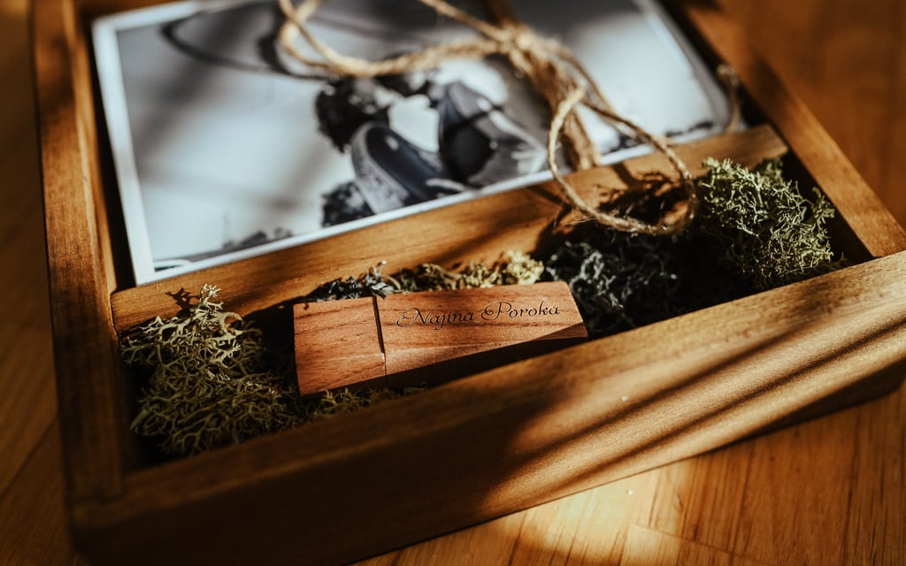 Personalizirana lesena škatljica z natisnjenimi najlepšimi spomini in USB ključek z vsemi vajinimi obdelanimi fotografijami.